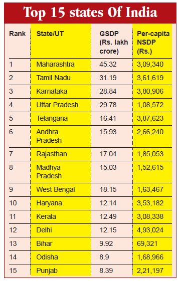 आरबीआई के डेटा के अनुसार महाराष्ट्र, तमिलनाडु और कर्नाटक सकल घरेलू उत्पाद (जीएसडीपी) में लीडर हैं जबकि पर कैपिटा इनकम (प्रतिव्यक्ति आय) में दिल्ली, तेलंगाना और कर्नाटक सबसे आगे हैं। आरबीआई ने हैंडबुक ऑफ स्टेटिस्टिक्स ऑन इंडियन स्टेट्स 2024-25 में भारत से सभी राज्यों के डेटा रिलीज किए हैं। रिपोर्ट के अनुसार महाराष्ट्र 45.3 लाख करोड़ रुपये के साथ सकल राज्य घरेलू उत्पाद (जीएसडीपी) चार्ट में सबसे ऊपर है, उसके बाद तमिलनाडु 31.1 लाख करोड़ रुपये के साथ दूसरे स्थान पर है। हालांकि उत्तर प्रदेश 29.7 लाख करोड़ रुपये के जीएसडीपी के साथ कर्नाटक (28.8 लाख करोड़ रुपये) से आगे है, लेकिन प्रति व्यक्ति आय के मामले में उत्तर प्रदेश केवल 1.08 लाख रुपये के साथ नीचे से दूसरे पायदान पर है। प्रतिव्यक्ति आय (पर कैपिटा इनकम) के मामले में केवल 69321 रुपये के साथ बिहार सबसे नीचे है। प्रति व्यक्ति शुद्ध राज्य घरेलू उत्पाद (एनएसडीपी) के आधार पर राज्यों की रैंकिंग करने पर एक अलग तस्वीर उभरती है। दिल्ली 4.93 लाख रुपये प्रति व्यक्ति एनएसडीपी के साथ देश में शीर्ष पर है - जो महाराष्ट्र के 3.09 लाख रुपये से काफी ऊपर है। तेलंगाना (3.87 लाख रुपये), कर्नाटक (3.80 लाख रुपये) और तमिलनाडु (3.61 लाख रुपये) भी शीर्ष आय वाले राज्यों में शामिल हैं। दूसरी ओर, बिहार और उत्तर प्रदेश इस अंतर को रेखांकित करते हैं। लगभग 9.9 लाख करोड़ रुपये की जीएसडीपी वाला बिहार, 69,321 रुपये की सबसे कम प्रति व्यक्ति आय दर्ज करता है। मध्य प्रदेश का जीएसडीपी 15 लाख करोड़ रुपये है लेकिन उसकी प्रति व्यक्ति आय केवल 1.52 लाख रुपये है। कुछ मध्यम आकार की अर्थव्यवस्थाएं अपने आकार से बेहतर प्रदर्शन कर रही हैं। 12.1 लाख करोड़ रु. की जीएसडीपी वाला हरियाणा की प्रतिव्यक्ति आय 3.53 लाख रुपये है जो कई बड़े राज्यों से अधिक है। हिमाचल प्रदेश (2.56 लाख रुपये) और उत्तराखंड (2.74 लाख रु.) जैसे छोटे क्षेत्र भी आय मापदंडों पर बड़े राज्यों से ऊपर स्थान रखते हैं। जहां तक राजस्थान की बात है तो यह पिछले वित्त वर्ष 2024-25 में 17.04 लाख करोड़ रुपये के जीएसडीपी के साथ छठा बड़ा राज्य है लेकिन 1.85 लाख रुपये की प्रतिव्यक्ति आय के साथ देश के मध्यम दर्जेे के राज्यों में शामिल है।
