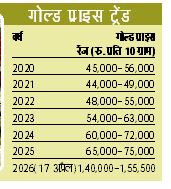 एक साल में सोना 115 फीसदी से अधिक बढ़ा : वर्ष 2024 में सोने की रेट्स 60000 से 72000 रुपए प्रति दस ग्राम के आसपास थी और पिछले 15 महिनों में सोने की रेट्स दोगुनी से ज्यादा हो गई है। वर्ष 2025 से 17 अप्रैल 2026 की तुलना की जाए तो सोने की रेट्स में करीब 116 फीसदी से अधिक का इजाफा हुआ है। 2025 में अक्षय तृतीया पर जयपुर सर्राफा मार्केट में सोने की रेट्स 98,000 रुपए प्रति दस ग्राम व चांदी की रेट्स 99,000 रुपए प्रतिकिलो के आसपास थी। अक्षय तृतीया 2025 से अब तक सोने की रेट्स में करीब 58 फीसदी की तेजी दर्ज की जा चुकी है। सोने की रेट्स में उछाल आने से ज्वैलरी मार्केट में 60 से 80 फीसदी ग्राहकी ठप हो गई है। शादी वाले घरों में या फिर जरुरतमंद कस्टमर द्वारा ही सोना परचेज किया जा रहा है वह भी लाइटवेट में। आम लोग फिलहाल सोने की ज्वैलरी की परचेज से किनारा कर रहे हैं। ज्वैलर्स ने बताया कि अमूमन फेस्टिव सीजन के बाद राजस्थान में अक्षय तृतीया के आसपास (अप्रैल-मई) शादियों के अच्छे मुहूर्त होने पर सोने का कंजंप्शन बढ़ जाता था, लेकिन ऐसा वर्तमान सिनेरियो में देखने को नहीं मिल रहा है। डायमंड ज्वैलरी का भी क्रेज निरंतर बढ़ता जा रहा है।