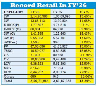 जीएसटी कट के बाद से ही लग रहा है ऑटो इंक ग्रोथ के साथ सही तरह से सिंक हो गई है। फाडा की लेटेस्ट रिपोर्ट के अनुसार भारत की ऑटो रिटेल सेल्स वित्त वर्ष 26 में 2.97 करोड़ यूनिट्स के रिकॉर्ड हाई लेवल पर पहुंच गई। 31 मार्च को समाप्त हुए वित्त वर्ष 26 के दौरान सभी सैगमेंट मिलाकर ऑटो रिटेल सेल्स में 13.3 परसेंट की अच्छी ग्रोथ हुई। फाडा के अनुसार 2.97 करोड़ यूनिट्स की रिटेल सेल्स ऑलटाइम हाई लेवल है और इंडस्ट्री पहली बार 3 करोड़ यूनिट के करीब पहुंची है। इस शानदार प्रदर्शन में मार्च 2026 की बड़ी भूमिका रही, जो ऑटो रिटेल के इतिहास का सबसे मजबूत महीना साबित हुआ। इस दौरान रिटेल सेल्स 25.3' बढक़र लगभग 27 लाख यूनिट तक पहुंच गई। यानी साल की ओपनिंग भले ही कमजोर रही हो लेकिन स्लॉग ओवर खासकर अक्टूबर से मार्च में हुई तेज रिकवरी से वित्त वर्ष की फिनिशिंग बहुत अच्छी रही। इसमें भी पॉजिटिव यह कि रूरल इंडिया की परफॉर्मेन्स अर्बन इंडिया से बेहतर रही। वित्त वर्ष 26 की सबसे बड़ी कहानी टू-व्हीलर सेगमेंट में फास्ट रिकवरी रही। इस सेगमेंट ने प्री-कोविड लेवल को पार कर लिया। टू-व्हीलर सेल्स 13.4' बढक़र 2.14 करोड़ यूनिट से ज्यादा हो गई। रिपोर्ट के अनुसार इसका बड़ा कारण एंट्री लेवल में अच्छे विकल्प, फाइनेंसिंग में सुधार और रूरल डिमांड में तेज को माना जा सकता है। वित्त वर्ष 26 के आखिरी महीने मार्च में टू-व्हीलर की रिटेल सेल्स लगभग 29 परसेंट उछली। वित्त वर्ष 26 के दौरान पैसेंजर वेहीकल सेगमेंट ने भी नया रिकॉर्ड बनाते हुए ऑल टाइम हाई 47 लाख यूनिट का लेवल पार कर लिया। इस सेगमेंट में भी रूरल डिमांड ने अर्बन मार्केट्स को पीछे छोड़ दिया। फाडा के अनुसार, वित्त वर्ष 26 में पीवी की रिटेल सेल्स 47,05,056 यूनिट्स रही। मार्च 2026 में यह 21.48 परसेंट ग्रोथ के साथ 4,40,144 यूनिट्स तक पहुंच गई। फाडा के प्रेसिडेंट सी. एस. विग्नेश्वर के अनुसार एफवाई26 भारतीय ऑटो रिटेल के लिए एक लैंडमार्क वर्ष रहा। मार्च की मजबूत ग्रोथ का बड़ा कारण वास्तविक ग्राहक मांग (जेनुइन रिटेल डिमांड) रहा। यह ग्रोथ सिर्फ डीलर चैनल पुश की वजह से नहीं, बल्कि बेहतर इन्क्वायरी कन्वर्जन, शोरूम विजिट और बेहतरीन कस्टमर कनेक्ट का नतीजा रही। मार्च में रूरल मार्केट्स में पीवी रिटेल 26.48' बढ़ी, जबकि अर्बन मार्केट्स में 18.46' की ग्रोथ हुई। फाडा के अनुसार पीवी इन्वेंटरी लेवल घटकर मार्च तक लगभग 28 दिन रह गया, जो एक साल पहले 50 दिन से ज्यादा था। वित्त वर्ष26 में सीएनजी वेहीकल्स का शेयर 21.98' जबकि ईवी का 4.25 परसेंट रहा। मार्च में तो ईवी का शेयर और बढक़र 5.11 परसेंट हो गया। कमर्शियल वेहीकल (सीवी) सेगमेंट वित्त वर्ष26 में रिटेल सेल्स 11.74 परसेंट बढक़र 10,60,906 यूनिट रहा, जो एफवाई19 के बाद पहली बार 10 लाख यूनिट के पार पहुंची है। मार्च में सीवी रिटेल 15.12 परसेंट बढ