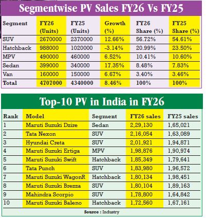 ये नारा सुना है ना...कहां पड़े हो चक्कर में, कोई नहीं है टक्कर में... भारत के पैसेंजर वेहीकल मार्केट पर बिल्कुल सही बैठ रहा हैै। इस मार्केट में प्रीमियमाइजेशन और दूसरा एसयूवाइजेशन (एसयूवी) का ट्रेंड है और एसयूवी के सामने कोई भी सैगमेंट टक्कर में नहीं बचा है। वित्त वर्ष 26 में भारत में पैसेंजर वेहीकल्स के कुल डीलर डिस्पैच 8.46 परसेंट की ग्रोथ के साथ 47,07,000 यूनिट (47 लाख 7 हजार) तक पहुंच गए। इस ग्रोथ में हेवीलिफ्टिंग (ज्यादा योगदान) की ज्यादातर जिम्मेदारी एसयूवी की रही, जिनकी सेल्स में 12.66 परसेंट की डबल डिजिट ग्रोथ हुई। इस ग्रोथ के दम पर कुल पीवी मार्केट में एसयूवी का शेयर भी बढक़र 56.72 परसेंट हो गया। साथ ही एमपीवी का शेयर 10.41 परसेंट रहा। यानी पीवी में यूवी सैगमेंट का कुल शेयर 67.13 परसेंट तक पहुंच गया। इसका सीधा अर्थ है कि हैचबैक, सेडान और वेन का दखल केवल 33 परसेंट मार्केट तक सिमट गया है। वित्त वर्ष 26 में एसयूवी सैगमेंट में कुल सेल्स 26,70,000 यूनिट्स की रही जबकि वित्त वर्ष 25 के 23,70,000 यूनिट्स ही बिकी थीं। इसके विपरीत, हैचबैक सेगमेंट गिरावट में रहा और इसकी सेल्स -3.14 परसेंट घटकर 10,20,000 से 9,88,000 यूनिट पर आ गई। इसके उलट एमपीवी सेगमेंट की ग्रोथ 6.52 परसेंट, वैन की 6.67 परसेंट और सेडान कीे सबसे ज्यादा 17.35 परसेंट रही। मार्केट शेयर के लिहाज से केवल एसयूवी (कुल यूवी नहीं) वित्त वर्ष 26 में 56.72 परसेंट तक पहुंच गए जो वित्त वर्ष 25 में 54.61 परसेंट था। वहीं हैचबैक का शेयर 23.50 परसेंट से घटकर 20.99 परसेंट रह गया। इस दौरान एमपीवी 10.41 परसेंट, सेडान 8.48 परसेंट और वैन का 3.40 परसेंट शेयर रहा और इनमें अमूमन कोई बड़ा बदलाव नहीं आया। इंडस्ट्री एक्सपर्ट्स का मानना है कि वित्त वर्ष 27 तक एसयूवी का शेयर 60 परसेंट तक पहुंच सकता है। एसयूवी की सेल्स में आ रही इस फास्ट्रेक ग्रोथ का बड़ा कारण लगातार नए मॉडल लॉन्च होना है। पिछले एक वर्ष के दौरान मारुति विक्टोरिस, टाटा सिएरा, रेनो डस्टर जैसे नए मॉडलों के साथ ही ह्यूंदे वेन्यू, किआ सेल्टॉस, महिन्द्रा थार, बोलेरो और एक्सयूवी3एक्सओ जैसे फेसलिफ्ट आने से भी ग्रोथ को सपोर्ट मिला है। ईवी सैगमेंट में मारुति की ई-विटारा, महिन्द्रा की एक्सईवी 9ई, हैरियर ईवी, विनफास्ट वीएफ6 और 7 जैसे मॉडल शामिल हैं। वित्त वर्ष 26 के टॉप 25 बेस्ट-सेलिंग पीवी में 15 एसयूवी केवल 5 हैचबैक, 3 एमपीवी और 1-1 मॉडल सेडान और वैन से थे। हालांकि, साल की सबसे ज्यादा बिकने वाली कार का खिताब मारुति डिजायर के नाम रहा वहीं एसयूवी में टाटा नेक्सॉन और ह्यूंदे क्रेटा अव्वल रहीं।
