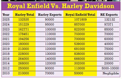 रॉयल एनफील्ड ग्लोबल 2-व्हीलर स्पेस में रॉयल बेंगाल टाइगर की तरह दहाडऩे लगी है। मिलियन क्लब में शामिल होकर और अब ग्रोथ का हाई गियर लगा रही है। यह कहने में कोई दोराय नहीं है कि रॉयल एनफील्ड अलग लीग में है और इसके मुकाबले में जिन भी मेनस्ट्रीम कंपनियों ने क्रूजर मॉडल लॉन्च किए वे ज्यादातर स्ट्रगल कर रहे हैं। आइशर मोटर्स ग्रुप की रॉयल एनफील्ड मिड से हाई रेंज मोटरसाइकल सैगमेंट में बहुत तेज बढ़ रही है और मार्केट रिपोर्ट्स कहती हैं कि अमेरिकी प्रेसिडेंट डोनाल्ड ट्रंप के दिल के करीब वाली हार्ले डेविडसन को निगलने लगी है। साथ में लगी टेबल से पता चलता है कि वर्ष 2010 के बाद एक और जहां रॉयल एनफील्ड की सेल्स 20 गुना हो चुकी है वहीं हार्ले डेविडसन की अमूमन आधी रह गई है। सीएलएसए, जेफरीज और मैक्वॉयरी आदि दिग्गज ब्रोकरेज फम्र्स ने अपनी रिसर्च रिपोर्ट में कहा है कि रॉयल एनफील्ड को जबरदस्त ब्रांड पुल मिल रहा है। यूथ फोकस्ड स्ट्रेटेजी और भारत में प्रीमियम प्रोडक्ट्स की ओर डिमांड शिफ्ट होने के मिले जुले असर से रॉयल एनफील्ड के लिए जबरदस्त कस्टमर कैचमेंट तैयार हो रहा है और कैपिटलाइज करने में मिल रही कामयाबी के चलते रॉयल एनफील्ड ....इन अ क्लास ऑफ इट्स ओन...में किलेबंदी कर रही है। रॉयल एनफील्ड ने कंपीटिशन को पीछे छोड़ दिया है और अपने सभी वैरिएंट्स में डोमिनेंट पोजिशन हासिल कर ली है। जेफरीज के डेटा के अनुसार रॉयल एनफील्ड का दबदबा हंटर 350 से शुरू होता है। यह बहुत तेजी से युवाओं में ट्रेंड करने लगी है और इस मॉडल के दम पर रॉयल एनफील्ड की सेल्स में 25 वर्ष से कम आयु के बायर्स का का शेयर 30-35 से बढक़र 40 परसेंट हो गया है। बड़ी बात यह है कि एंट्री लेवल पर पोजिशन होने के बावजूद हंटर फ्लैगशिप रेंज क्लासिक की सेल्स को कैनिबलाइज नहीं कर रही है। कैनिबलाइज करना यानी एक ही कंपनी के दो प्रोडक्ट्स में कंपीटिशन शुरू हो जाना। हंटर सीरीज ने अपने लिए टीवीएस अपाचे, यामहा एमटी-15 और रिट्रो प्रतिद्वंद्वियों जैसे जावा 42 और होंडा सीबी350 जैसे कंपीटिटर तलाश लिए हैं। हंटर की वॉल्यूम ग्रोथ के बावजूद कंपनी का फ्लेगशिप मॉडल क्लासिक 350 सबसे अधिक वॉल्यूम वाला मॉडल बना हुआ है, और होंडा सीबी350, जावा क्लासिक और येजदी रोडस्टर जैसे कंपीटिटर के अटैक से बेअसर बना हुआ है। 350सीसी की बुलट रॉयल एनफील्ड ब्रांड को रूरल और सेमी अर्बन मार्केट्स में मजबूत बनाए हुए है। कुछ हद तक जावा के सिवाय इसका कोई कंपीटिशन नहीं है। बुलट लीगेसी पहचान के दम पर टिकी हुई है वहीं मीटियोर 350, आरई के 350सीसी क्रूजर के नीश सेगमेंट में हाई परफॉर्मर साबित हो रही है। इंटरसेप्टर, कॉन्टिनेंटल जीटी, और हिमालयन 450 मिलकर प्रीमियम पोर्टफोलियो मजबूत कर रहे हैं। मैक्वॉयरी के अनुसार लैटिन अमेरिका औ